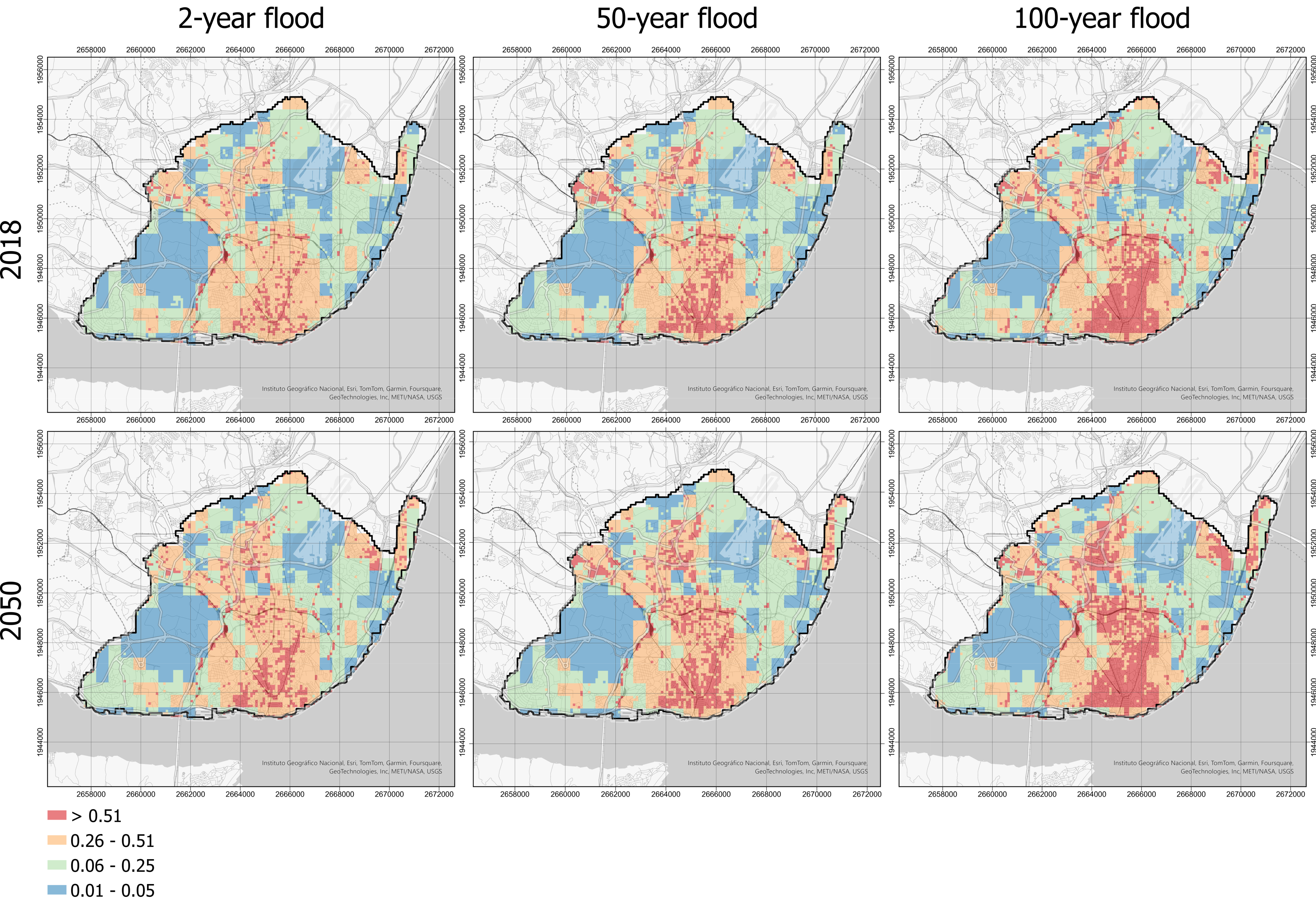 Flood risk maps for Lisbon for 2-, 50-, and 100-year return periods in 2018 and 2050 show how increased artificialization drives higher exposure across the city’s floodplains.