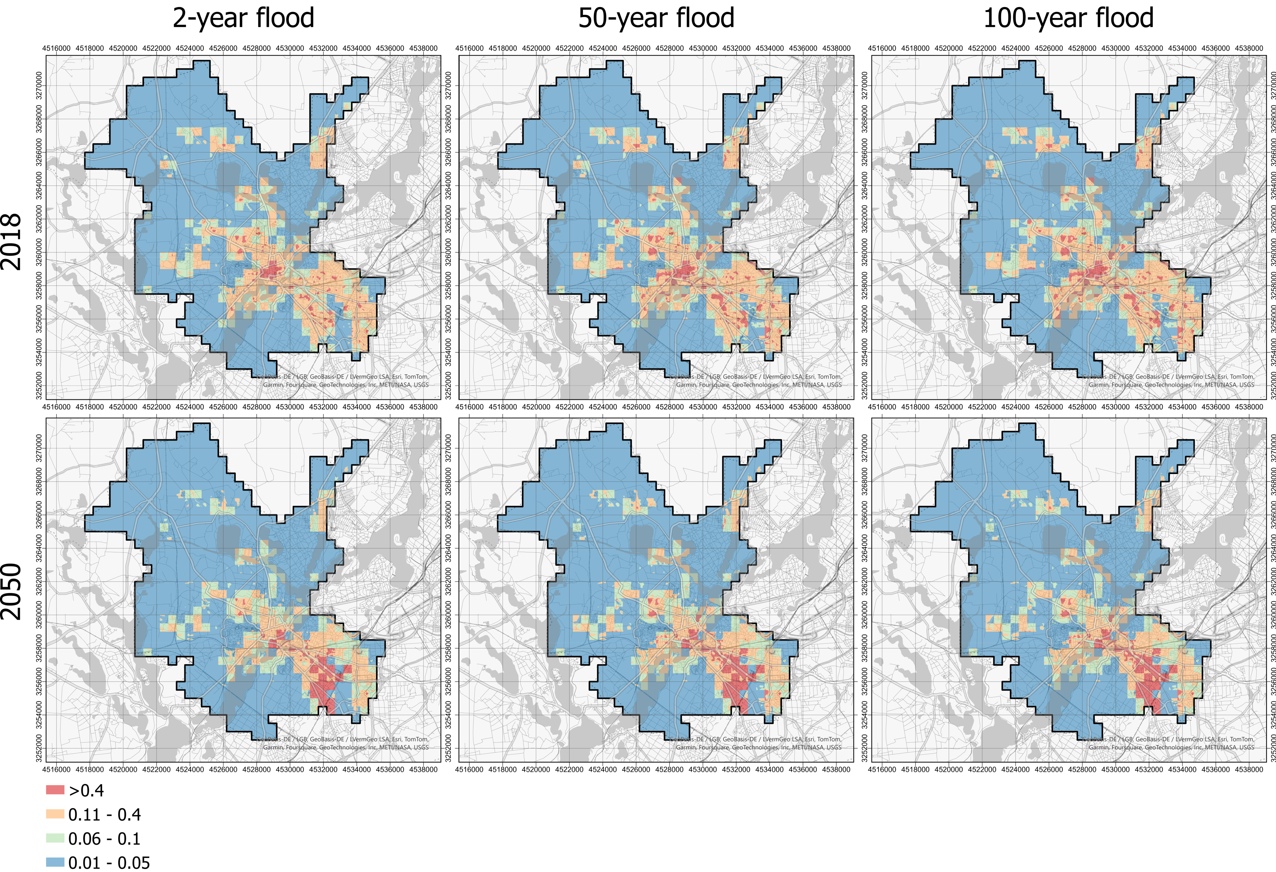 Potsdam’s 2-, 50-, and 100-year return-period maps highlight how land-cover change synchronizes losses in flood protection with the expansion of vulnerable zones through 2050.